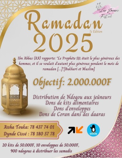 Ce Ramadan, les soeurs Fillah organisent leurs 7e édition d'opération ramadan avec une collecte pour venir en aide aux nécessiteux. Nous sollicitons donc votre contribution de toute nature pour y parvenir