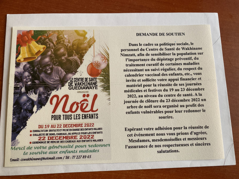 Le personnel du centre de santé de Wakhinane souhaiterait organiser une semaine de consultation gratuite ( prise en charge bilan et ordonnances) clôturée par une cérémonie de remise de cadeaux afin de redonner le sourire aux enfants vulnérables et issus de familles démunies. Nous comptons sur les bonnes volontés pour faire vivre au moins une fois à ces enfants la magie de Noël