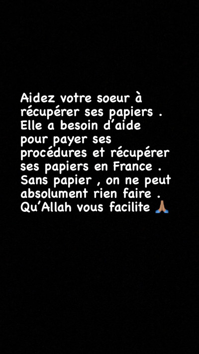 Je suis en France depuis 2014 et mes nombreuses réorientations dans le cadre de mon Master ont joué sur mes papiers (titre de séjour) . Cependant, j'ai un défenseur de Droits qui peut m'aider à les récupérer rapidement (puisque je vis en France depuis plus de 5ans et que j'ai un diplôme ici aussi) . Toute la procédure me revient à 2200 euros et comme j'ai étée arrêtée au travail à cause de mes papiers depuis quelques mois, je ne peux pas me payer la procédure . Je vous demande alors de venir en aide votre soeur svp