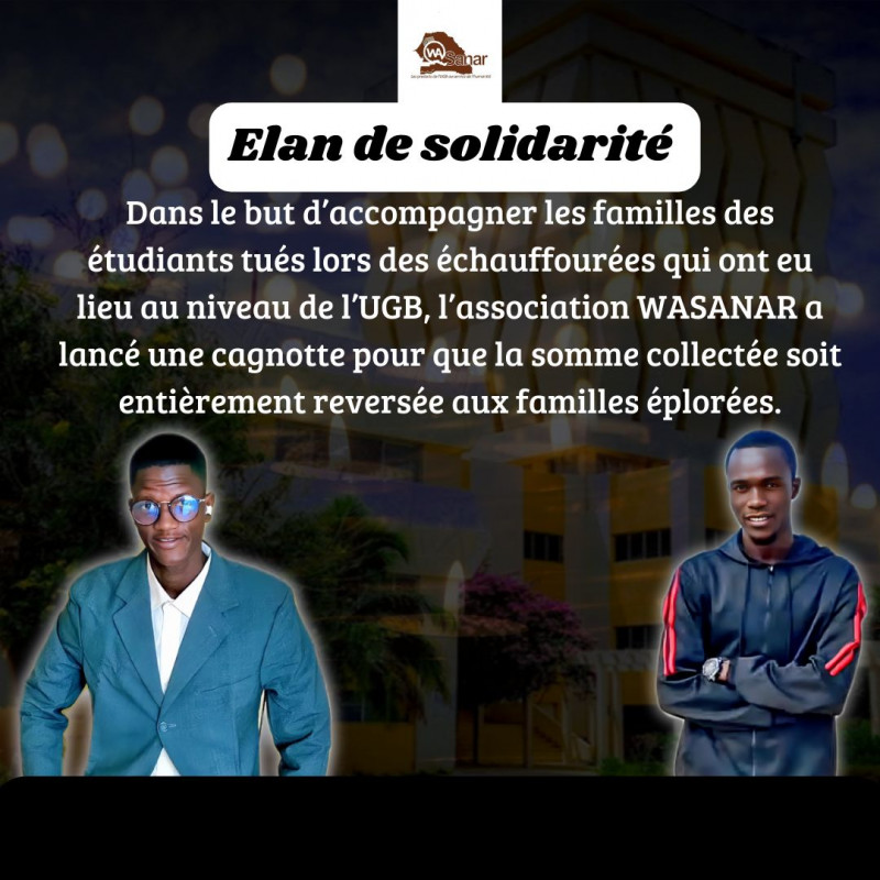 Appel à la solidarité en soutien aux familles de nos jeunes frères étudiants de l'UGB, qui ont perdu la vie lors des manifestations. Nous sollicitons la sensibilité de tous les alumni pour exprimer notre solidarité envers les familles des victimes.